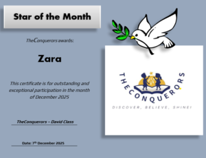 What is star of the Month– Each month on Kahoot Sundays, TheConquerors acknowledges the children’s efforts by awarding them certificates. First-time winners receive a Bible along with a certificate based on their attendance, behaviour, and participation in class. This is aimed at encouraging them and recognizing their hard work.